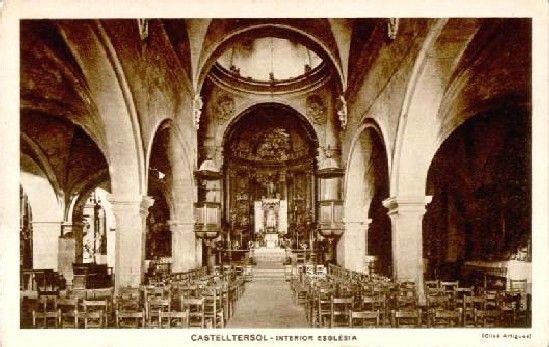 Any 1930. Interior de l'església abans de ser incendiada l'any 1936. Després de la Guerra Civil tan aviat com es va poder es van fer les obres de reforma. Hi ha dues grans novetats que identifiquen l'església antiga de l'església reformada: el baldaquí de l'altar i els bancs en substitució de les cadires.