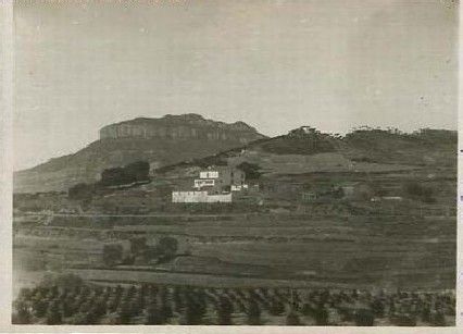 Any 1908. Masia de Can Déu a Sant Feliu de Codines i cingles de Gallifa al fons.