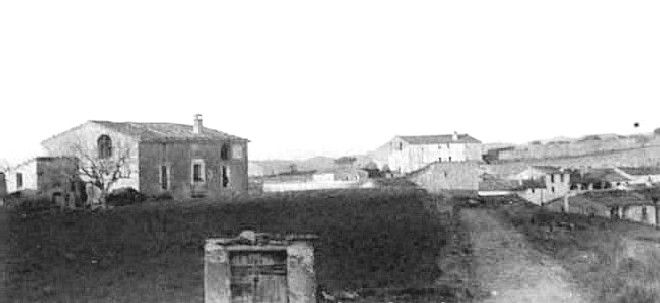 Any 1930. La casa de Cal Macià en primer terme i al seu darrera a la dreta Cal Llogari. El camí ample és el del Grau i les altres casetes serien del carrer Manresa.