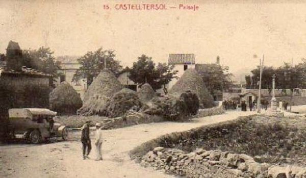 Any 1913. Obertura de la carretera en els seus inicis. Els pallers és probable que siguin de ca l'Anfruns (l'actual Hostal) a on s'hi realitzaven habitualment feines del camp. Al fons a la dreta es pot veure l'antiga creu de terme d'entrada a la vila.